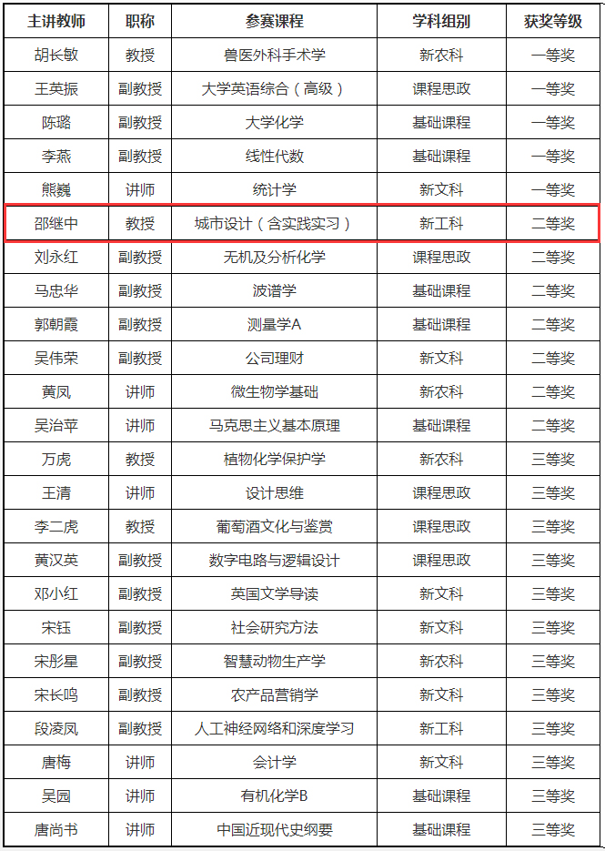根据中国高等教育学会《关于举办第四届全国高校教师教学创新大赛的通知》、湖北省高等教育学会《关于举办第四届湖北省高校教师教学创新大赛的通知》等文件精神,按照437ccm·必赢国际第四届教师教学创新大赛赛事安排,经学院遴选推荐、材料评审、现场评审等环节,大赛最终评选出一等奖5人,二等奖7人,三等奖12人。必赢国际官网风景园林系教师邵继中团队获二等奖,团队成员杨璐、夏欣、丁静蕾。